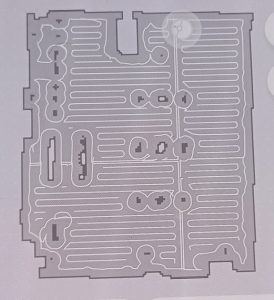 De grijze vlekjes zijn obstakels. Als Alie vervolgens aan het werk gaat kan je haar op het scherm van je telefoon precies volgen. Ze deelt de ruimte in 4 kwarten in. Ieder kwart wordt met fascinerende nauwkeurigheid afgewerkt. Dat ziet er dan als volgt uit. De witte lijnen geven het parcours weer dat ze aflegt.