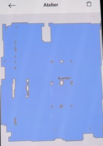 Ik heb met veel bewondering gekeken naar hoe Alie haar werk doet. In het volgende voorbeeld dweilt en stofzuigt Alie het atelier van Marleen. Een ruimte van 50m2 met enkele lastige obstakels. Eerst maakt Alie een kaart van de ruimte. Ze rijdt dan ongeveer anderhalve minuut ogenschijnlijk willekeurig wat rond en zegt dan: “mapping completed” (ik ben klaar met het maken van een plattegrond). Die ziet er als volgt uit: