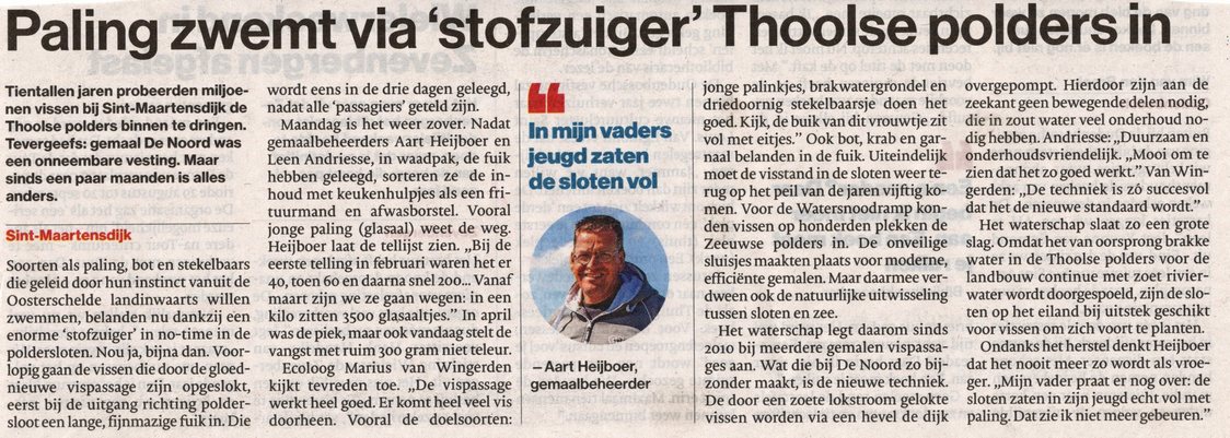 Dan moet ik maar schrijven over de glasaaltjes en driedoornige stekelbaarsjes die sinds kort weer vanuit de Oosterschelde de Thoolse poldersloten in kunnen zwemmen. Ik heb nooit geweten dat stekelbaarsjes rondzwemmen in de Oosterschelde. Ik ken ze alleen van de poldersloten bij Rotterdam uit mijn jeugd.
