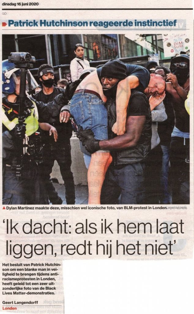 en een foto van een zwarte man die een zwaar gewonde rechts extremistische man in veiligheid brengt voordat de lynchpartij zou eindigen met de dood