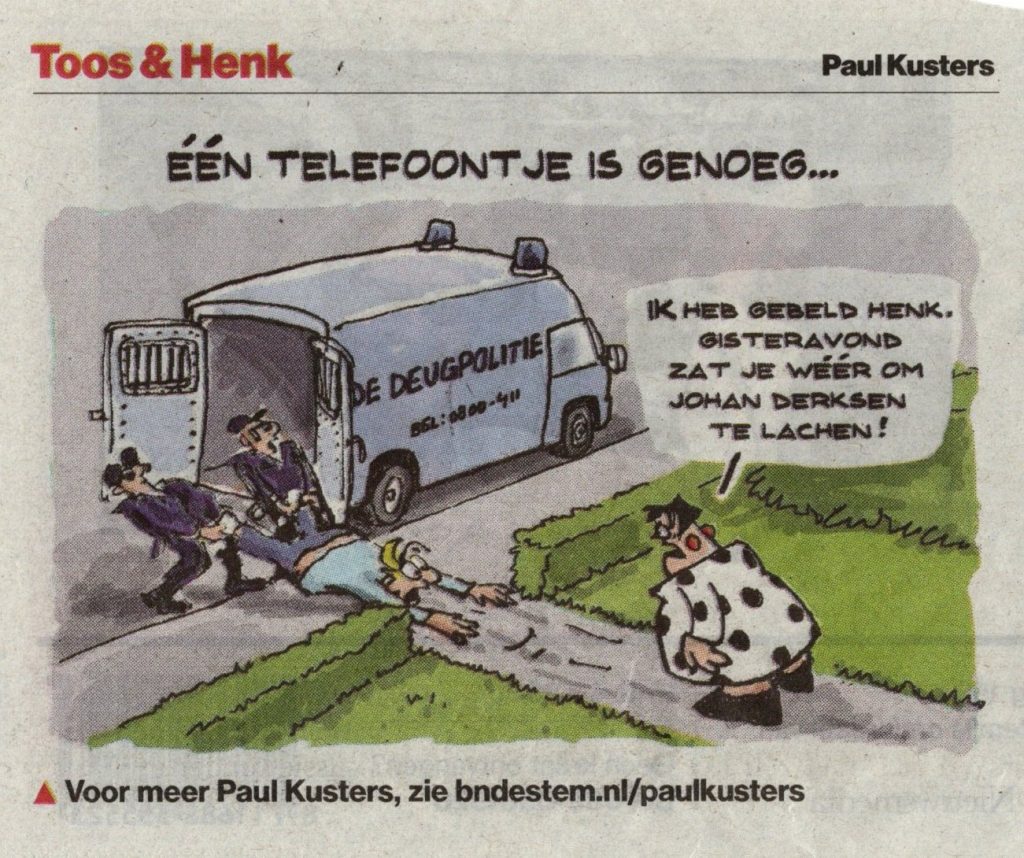 Over alle protestmanifestaties over kleuren en beelden die we momenteel dagelijks de media zien beheersen, ga ik niets zeggen. Dat is gevaarlijk. Voordat je het weet word je in één van de kampen getrokken. Wij wonen in een straat die vernoemd is naar een heerlijk geurende struik. Maar je zal maar in de zeeheldenbuurt wonen. Ik houd het deze keer bij een goede cartoon van Toos en Henk
