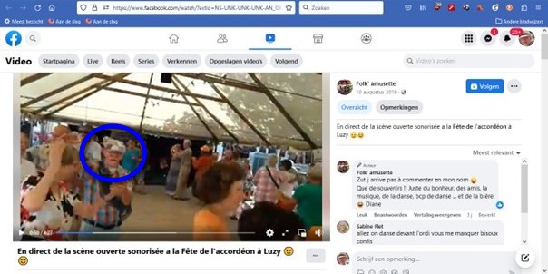 Er zijn nog veel meer van die Franse volksdansen die tot mijn verbazing bij heel veel Fransen bekend zijn. Wij hebben twee keer gepoogd in een workshop ook zo’n dans te leren, maar met weinig succes. De állereenvoudigste is de Cercle Cercassien, die kan ík zelfs meedoen. Die is zo simpel dat het in Nederland niet tot veel enthousiasme zal leiden. Bij toeval vond ik op Facebook een filmpje van een klein podiumpje, gemaakt door een Fransman, waarop ik ook meedoe. Helaas lukt het me niet om het filmpje in mijn blog te plakken. Ik heb wel een screenshot kunnen maken om te bewijzen dat ik het echt ben.