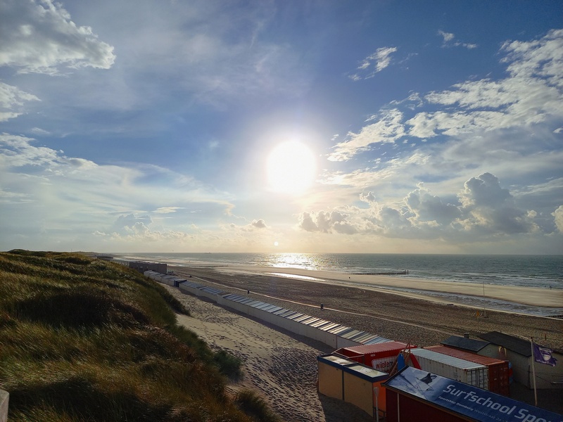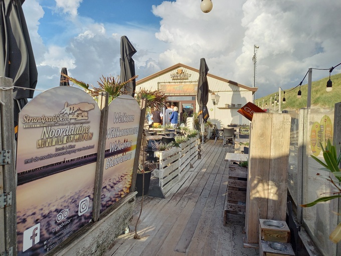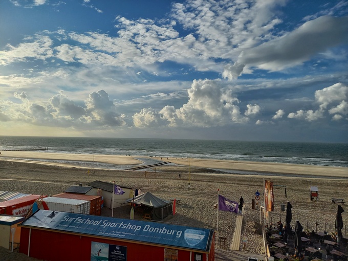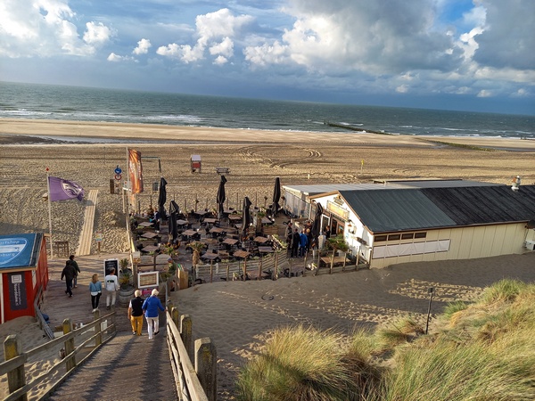 Eerder in de vakantie hadden we met kennissen in het strandpaviljoen dicht bij onze camping gegeten. Daar werd voor mij een vispotje geserveerd dat meer dan uitstekend smaakte en voor Marleen een gegrilde dorade. Dus in plaats van heel Walcheren te doorkruisen voor een goed visrestaurant met saaie gerechten, hebben we voor het strandpaviljoen gekozen dat overigens niet in de lijst van visrestaurants voorkwam. Daar hebben we prima gegeten, kijkend over een woeste zee met ondergaande zon en dreigende wolken. Heel mooi.