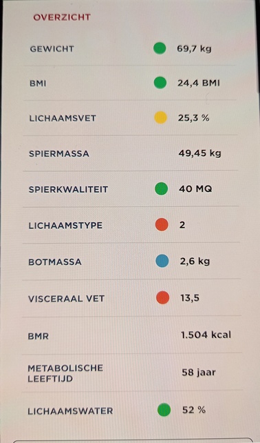 Vorige week schreef ik terloops op dat ik sinds kort, samen met Marleen, naar de sportschool ga. Als de leeftijd stijgt, moet je toch iets meer doen om het lijf in conditie te houden. Bij mijn tweede bezoek werd er ook een nul-meting gedaan. Ik moest op een speciale weegschaal staan die met een snoer verbonden was met een soort stuur. Het apparaat meet dan diverse lichaamsfuncties die vervolgens in een app terecht komen. Er rolde een mooi overzicht uit: