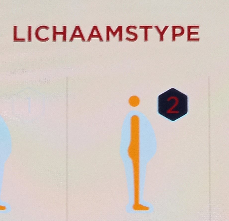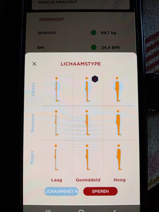 Ik was in eerste instantie blij met de resultaten. Wie zou er niet blij zijn met een metabolische leeftijd van 58 jaar als je al 68 bent. Maar toen ik op “lichaamstype” klikte waar een rood bolletje bij staat (rood is meestal niet goed), werd ik iets minder blij. Want de app beschuldigde mij ervan dat ik OBESE ben.