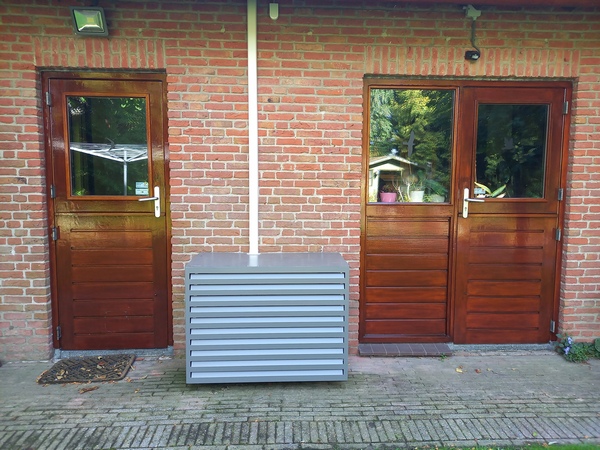 Er is een buitendeel met een grote ventilator en een compressor die warmte aan de buitenlucht onttrekt. Het is bepaald geen sieraad voor de tuin. Wij hebben er een kast omheen laten zetten om het visuele leed enigszins te verzachten: