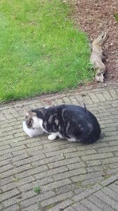 Gisteren kreeg ik een telefoontje dat Ivo gesignaleerd was in en bij de schuur van een familie die met vakantie is. In de schuur wordt door de buurman voer voor de katten van de vakantiegangers gezet. En kennelijk heeft Ivo besloten een paar dagen te gaan logeren bij die katten. Vanmiddag zat hij opeens weer bij ons in de tuin.