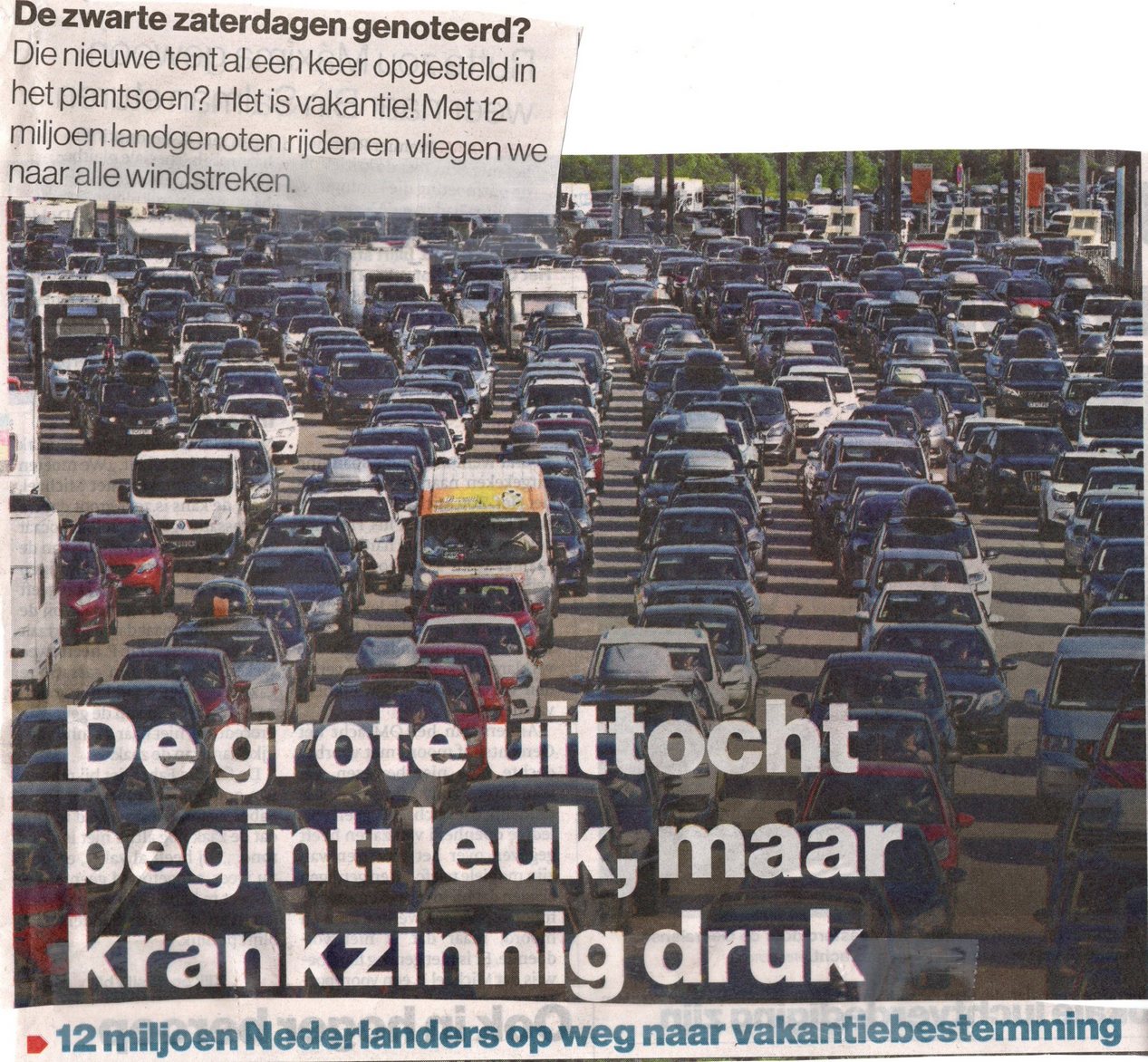 en je staat of rijdt heel erg langzaam  in je elektrische auto tussen al die elektrische auto’s die allemaal een laadpaal gaan zoeken om verder te kunnen rijden. Dit doemscenario heb ik al eerder beschreven. Maar met deze foto in de krant kon ik het niet laten om het nog een keer te doen.