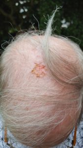 Ik krijg af en toe de vraag waarom ik altijd een hoofddeksel draag. Daar zijn natuurlijk voor de hand liggende redenen te bedenken zoals het gebrek aan haar bedekken. In mijn geval is dat niet zo, ik loop het liefst blootshoofds. Er zijn ook minder voor de hand liggende redenen. Mijn hoofdhuid is erg kwetsbaar. Het gebrek aan haar is wat dat betreft geen voordeel. Zonlicht, en dat is er ook bij bewolkt weer, zorgt voor vervelende beschadiging wat kan uitgroeien tot huidkanker. De dokter adviseert dus om de huid te bedekken. Ondanks dat moet ik toch regelmatig naar de dokter om enkele aangedane plekjes weg te laten branden met vloeibare stikstof.